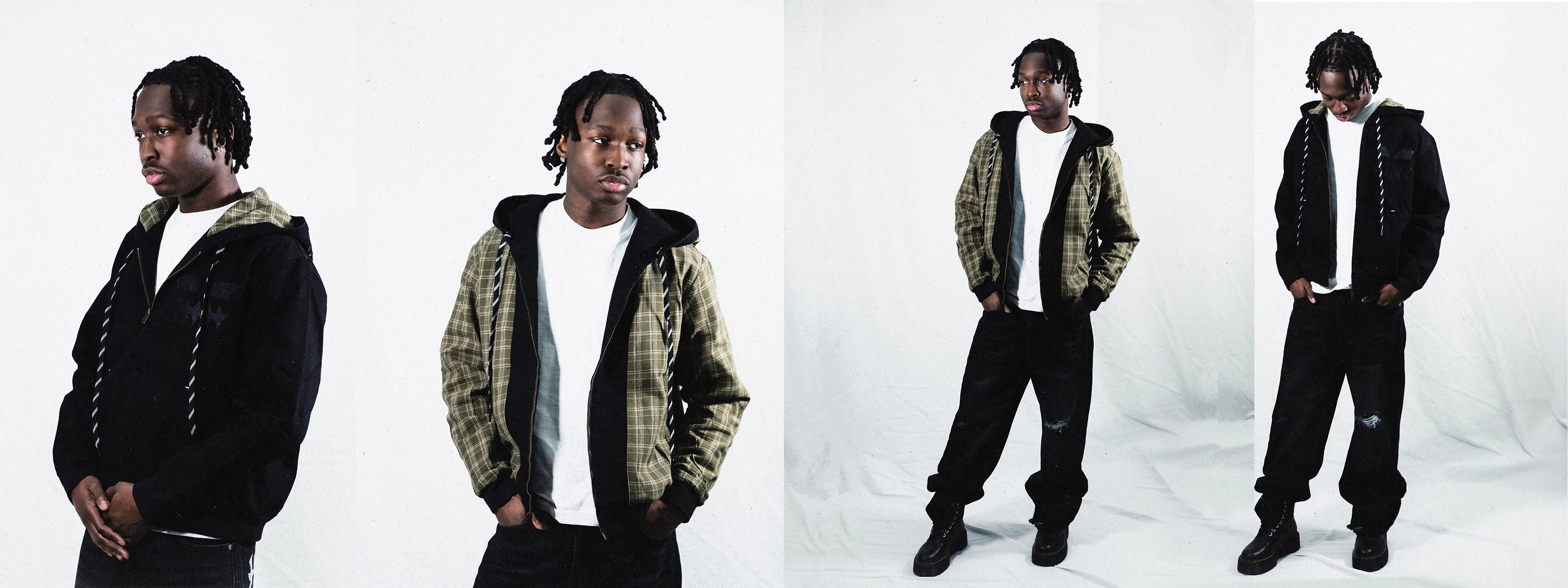 Jacket made out of a 14.Oz Denim lined with a green plaid fabric. Features a hood, front kangaroo pockets and front zip closure. Cut to be relaxed fit and hip length.